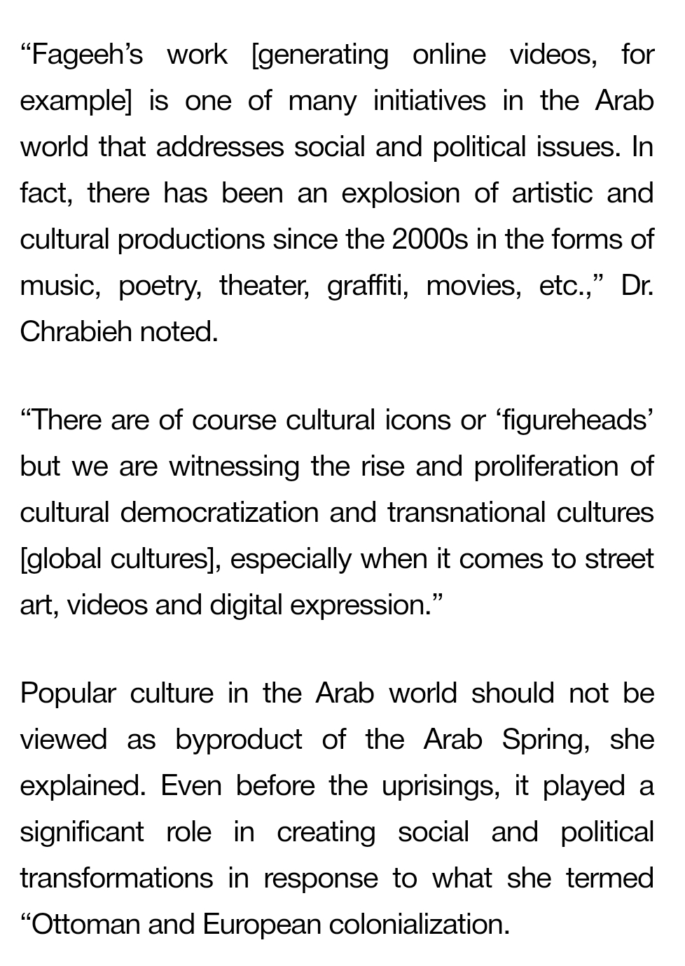 “Fageeh’s work [generating online videos, for example] is one of many initiatives in the Arab world that addresses social and political issues. In fact, there has been an explosion of artistic and cultural productions since the 2000s in the forms of music, poetry, theater, graffiti, movies, etc.,” Dr. Chrabieh noted.