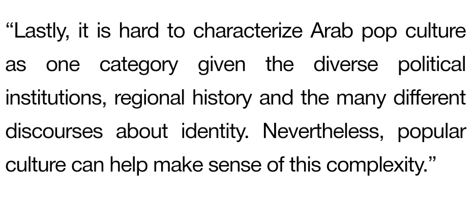 “Lastly, it is hard to characterize Arab pop culture as one category given the diverse political institutions, regional history and the many different discourses about identity. Nevertheless, popular culture can help make sense of this complexity.”