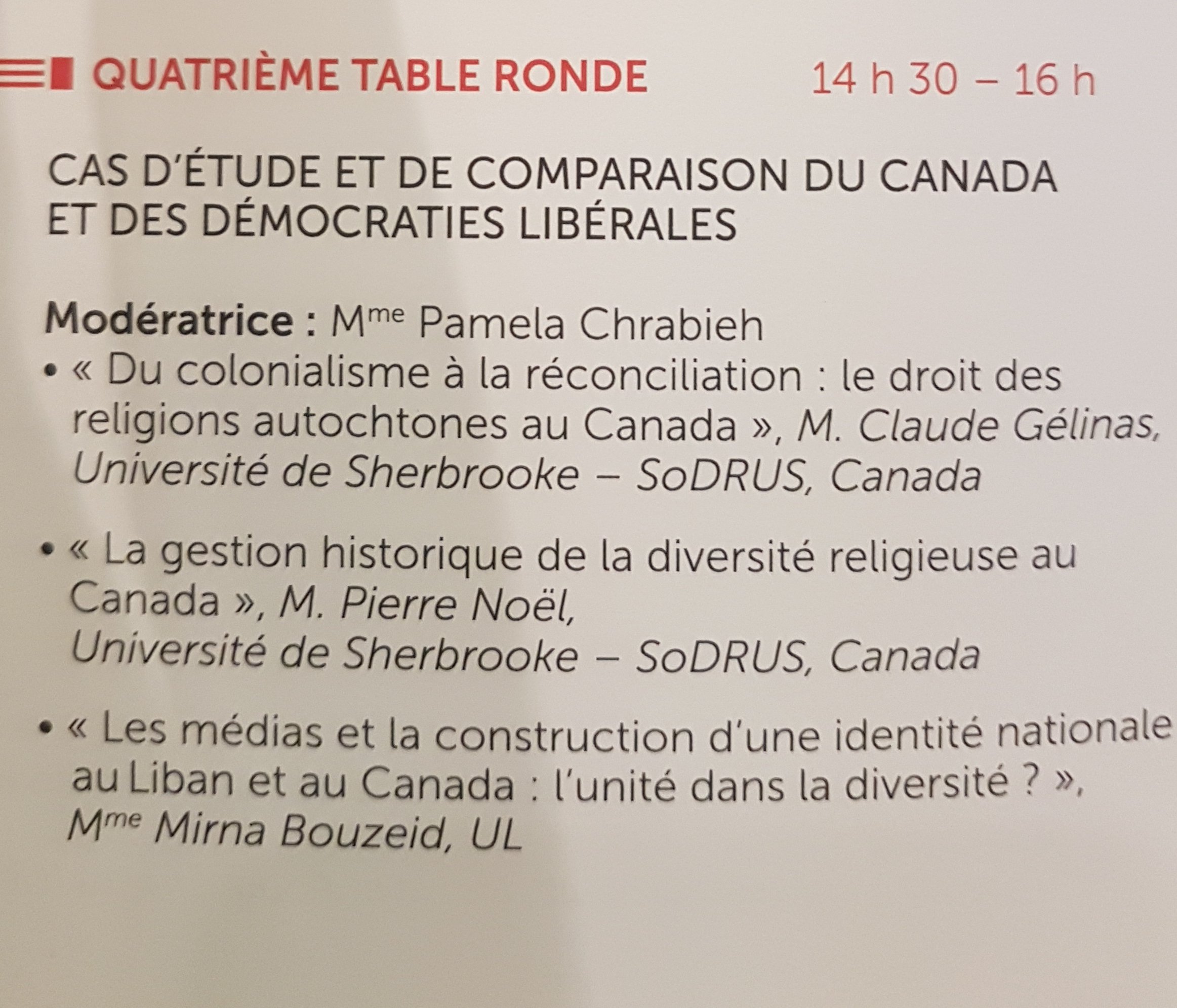Ce fut un plaisir de revoir et de rencontrer des collègues du Québec, et de modérer la 4e table ronde du colloque “Les communautés de l’Etat du Liban” organisé par le Centre de Recherche sur les Minorités au Moyen-Orient (RCMME) et le Centre de Recherche Société, Droit et Religions de l’Université de Sherbrooke. Avec les intervenants Mirna Bouzeid, Pierre Noel et Claude Gelinas. Un grand merci au Prof. Sami Aoun, ainsi qu’aux P. Jean Akiki et Georges Yarak pour l’invitation. Certes, les perspectives comparatives entre le Canada et le Liban devraient se poursuivre vu qu’elles permettent les décentrements nécessaires afin de repenser la gestion de la diversité.