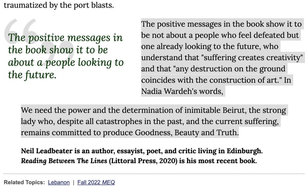 Check out Neil Leadbeater’s review of our anthology “The Beirut Call” in Middle East Quarterly, Fall 2022.