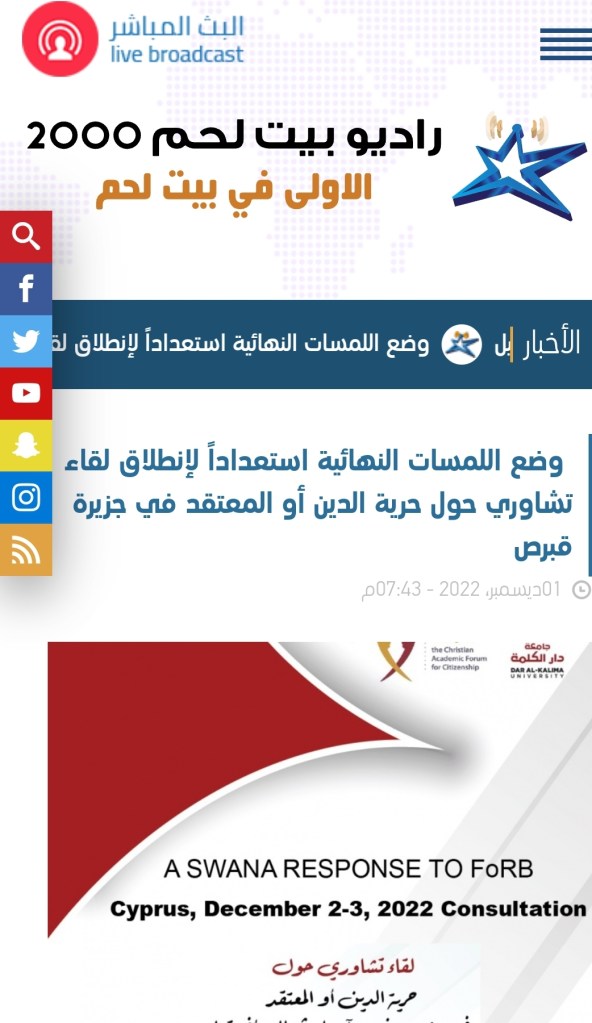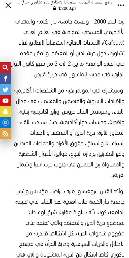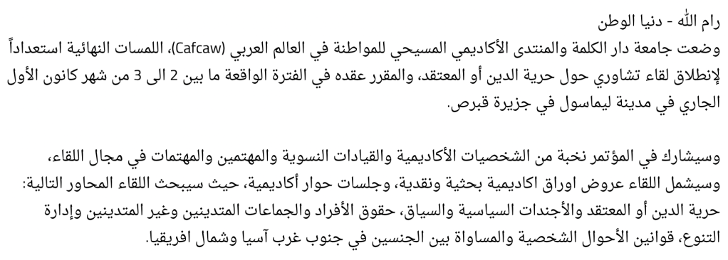 وضعت جامعة دار الكلمة والمنتدى الأكاديمي المسيحي للمواطنة في العالم العربي (Cafcaw)، اللمسات النهائية استعداداً لإنطلاق لقاء تشاوري حول حرية الدين أو المعتقد، والمقرر عقده في الفترة الواقعة ما بين 2 الى 3 من شهر كانون الأول الجاري في مدينة ليماسول في جزيرة قبرص .