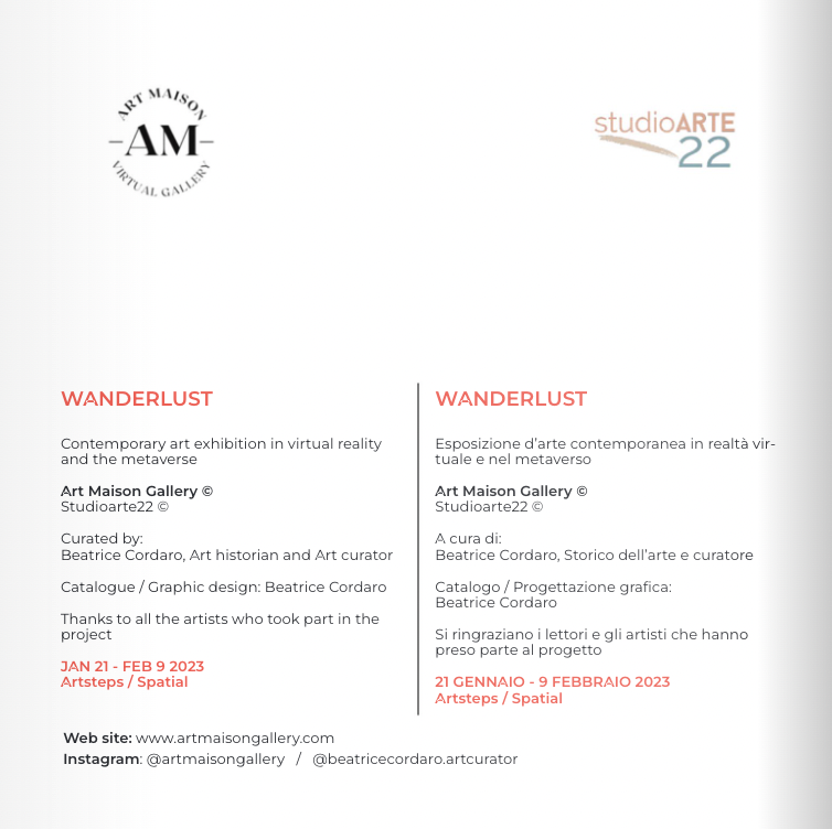 The “Wanderlust with Art” Contemporary Virtual Art Exhibition is live from January 21 to February 9, 2023 on artsteps and spatial.io. Organized by Art Maison Gallery and Studioarte22 (Italy). Thanking Beatrice Cordaro for curating and exhibiting my artworks.
