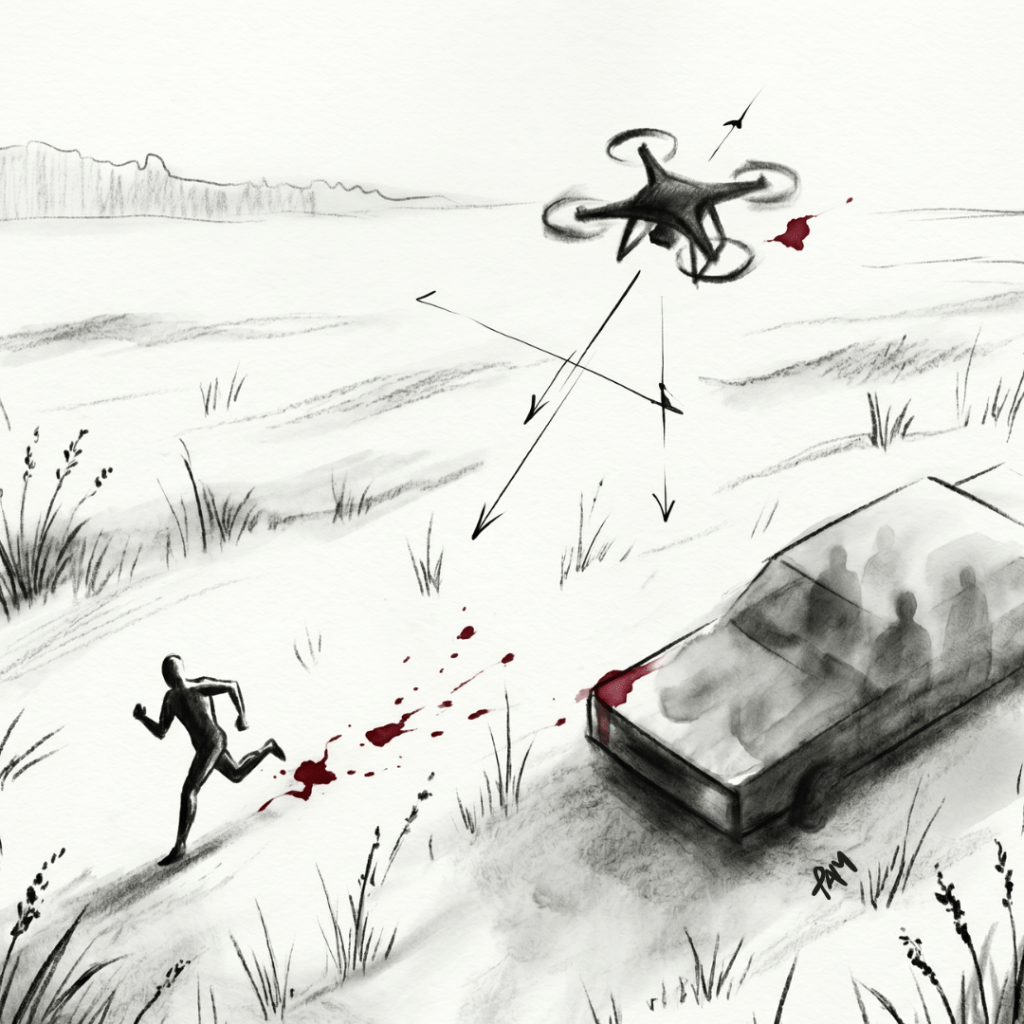 Le jeune homme (non armé) qui court dans le champ est l’image même de notre humanité réduite à son minimum biologique. Privé de couvert, de droit, de refuge. Il court dans un paysage où même la terre a cessé d’être une promesse d’abri. Le champ n’est plus cet espace de persistance cher à nos ancêtres, mais un écran sans bords où chaque mouvement est corrélé et punissable. On ne tue pas seulement un homme, on assassine la grammaire même du refuge. On veut prouver qu’aucun horizon n’est assez vaste pour échapper aux capteurs.