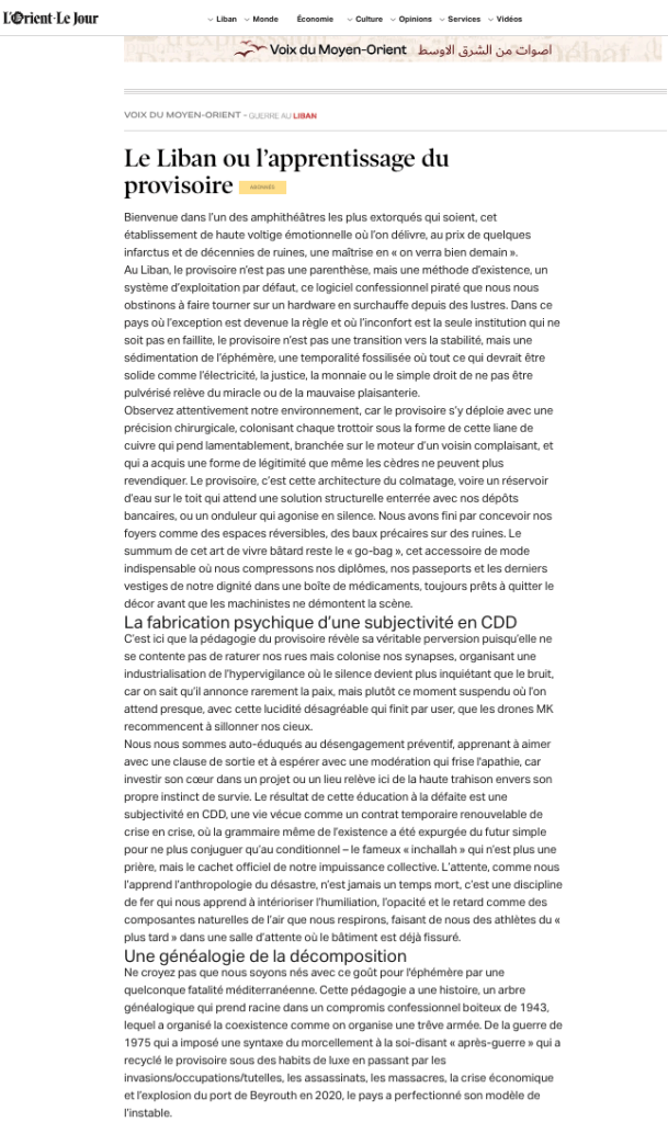 Au Liban, le provisoire n’est pas une parenthèse, mais une méthode d’existence, un système d’exploitation par défaut, ce logiciel confessionnel piraté que nous nous obstinons à faire tourner sur un hardware en surchauffe depuis des lustres. Dans ce pays où l’exception est devenue la règle et où l’inconfort est la seule institution qui ne soit pas en faillite, le provisoire n’est pas une transition vers la stabilité, mais une sédimentation de l’éphémère, une temporalité fossilisée où tout ce qui devrait être solide comme l’électricité, la justice, la monnaie ou le simple droit de ne pas être pulvérisé relève du miracle ou de la mauvaise plaisanterie.