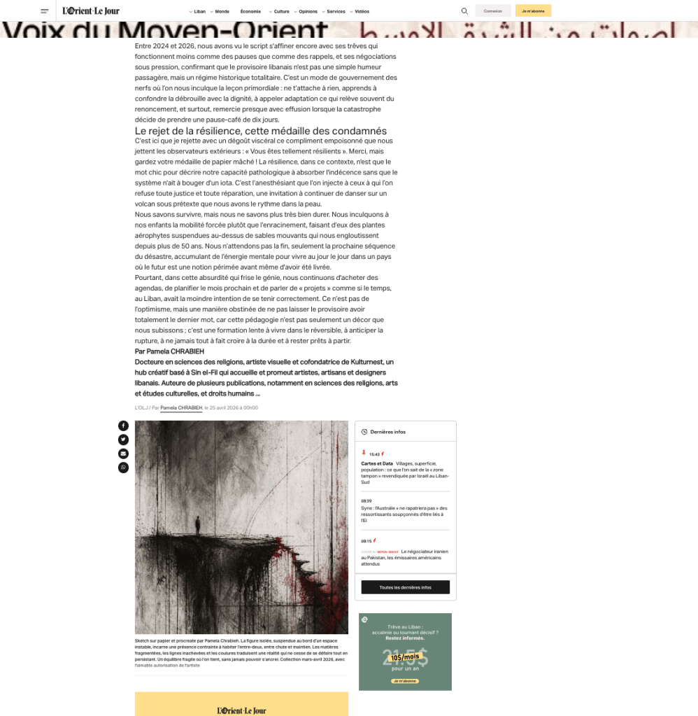 Lire mon texte complet dans l’L’Orient-Le Jour! Merci pour la publication de mon coup de gueule et de mon oeuvre hybride!