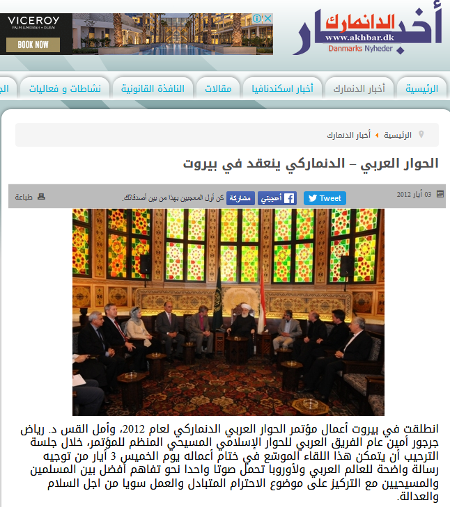 الحوار العربي – الدنماركي ينعقد في بيروت, Press News, Akhbar al Denmark – Danmarks Nyheder, 03-05-2012 (in Arabic).