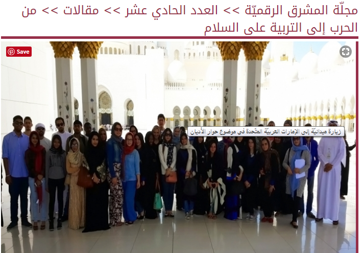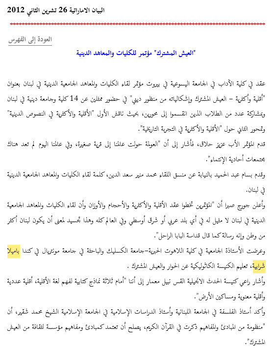 “العيش المشترك” مؤتمر للكليات والمعاهد الدينية, Press News, البيان الاماراتية 26 تشرين الثاني 2012, UAE, 26-11-2012 (in Arabic).