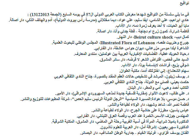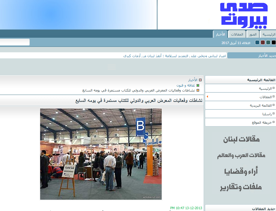 نشاطات وفعاليات المعرض العربي والدولي للكتاب مستمرة في يومه السابع, Press News, Echo Beirut – Sada Beirut, 13-12-2013 (in Arabic).