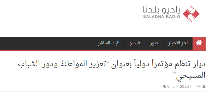 ديار تنظم مؤتمراً دولياً بعنوان تعزيز المواطنة ودور الشباب المسيحي, Baladna Radio, 12-2016 (in Arabic).