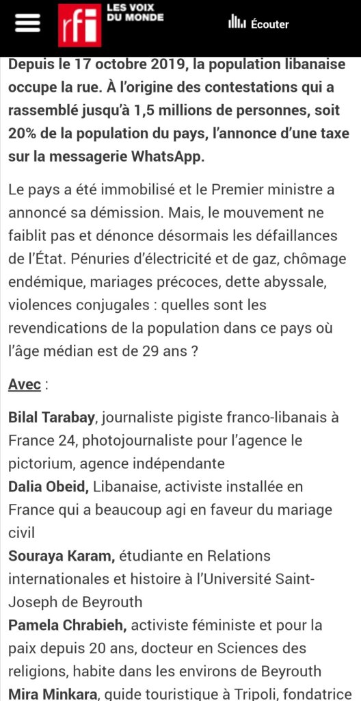 Liban: que demande la jeunesse? Entrevue par Emmanuelle Bastide, Emission 7 milliards de voisins, Radio France Internationale (RFI), France, 19 Novembre, 2019.