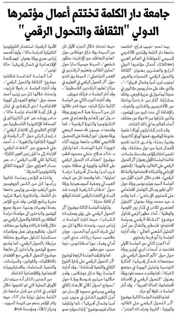 Dar al-Kalima University and Cafcaw’s Round Table “Culture, Religion, Higher Education, and Digital Transformation in SWANA: Challenges and Opportunities”, Larnaca – Cyprus, June 9-10, 2023 – Press Coverage Full File.